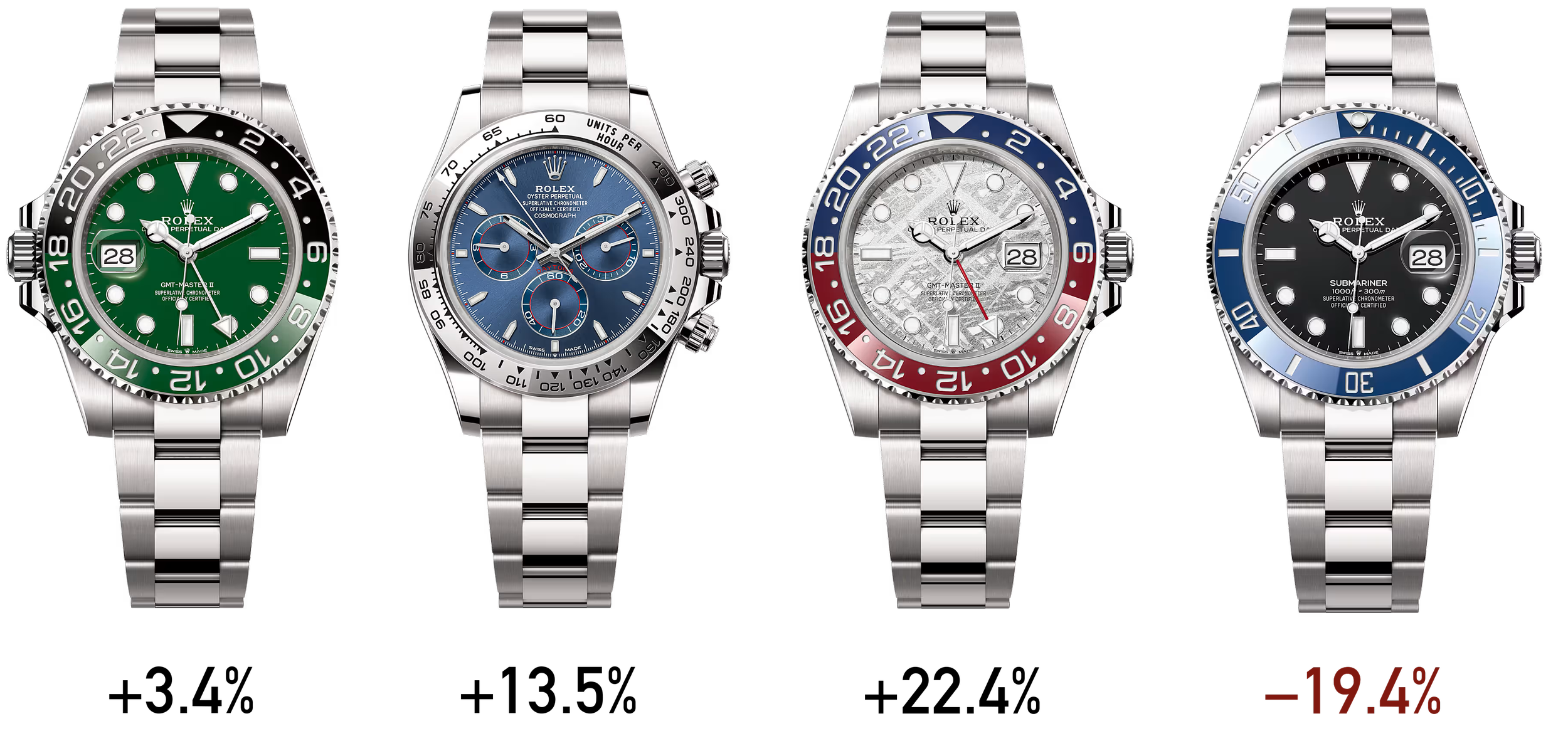According to Chrono24, which has visibility into actual sold prices on its platform, not just list prices, the average sold price of an unworn Submariner in white gold stands at $42,000. That means a drop of roughly $10,000 from retail, or about 19%, for a watch resold immediately after purchase. The discount widens to a staggering 25% once the watch has been worn. Some may say white gold and steel are too similar in appearance, but it is a fate not necessarily shared by other references.
