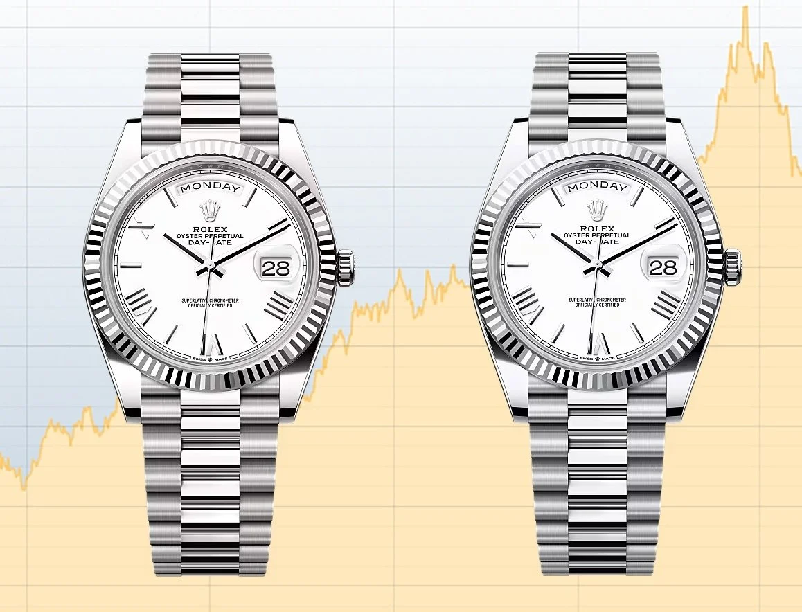 Rolex does not publish metal weights, but estimates based on total watch weight and shared components show that the white-gold Day-Date contains about 5.3 troy ounces of pure gold. In today’s market, that is worth roughly $26,500. The platinum model contains about seven ounces of platinum, valued near $14,700.
